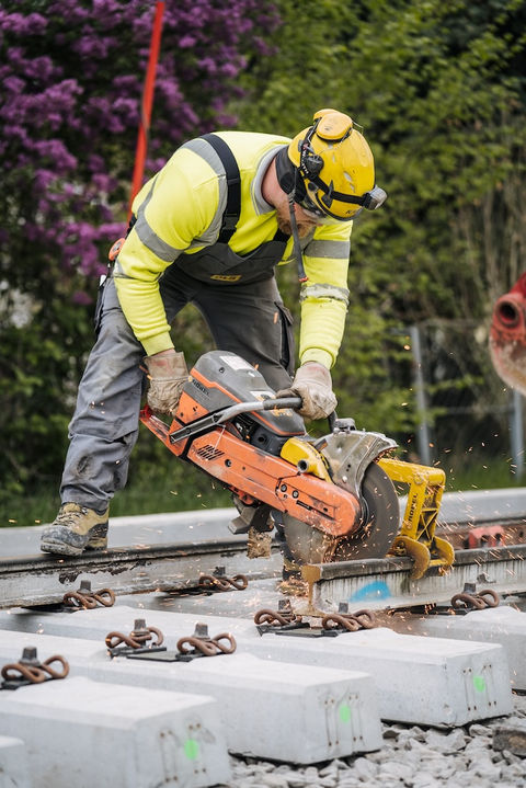 ... und halte dabei alle Sicherheitsvorschriften - mit Helm, Warnweste und Stahlkappenschuhen - ein.